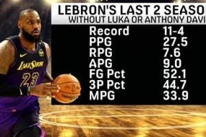 媒体oh he didn't列举出湖人球星詹姆斯最近两个赛季以来在东契奇或者安东尼·戴维斯缺阵时的表现: