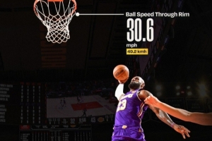 根据统计,詹姆斯的这记势大力沉的扣篮起跳距离为3.2米,篮球穿越篮筐的速度为49.2公里/小时。